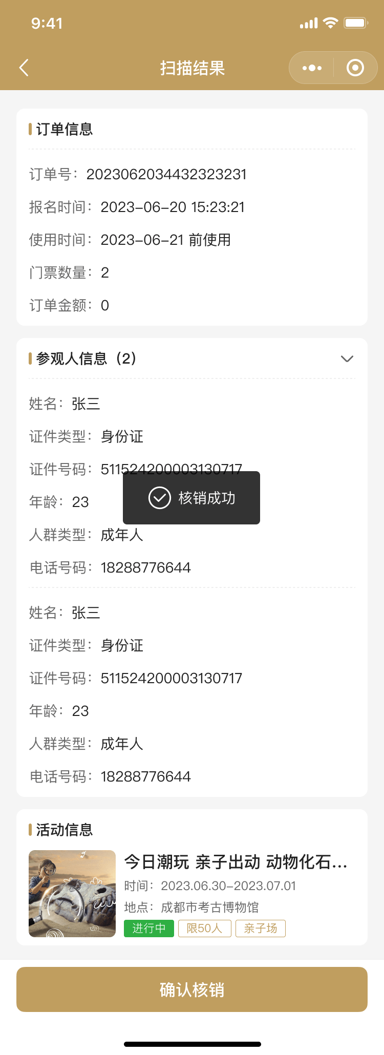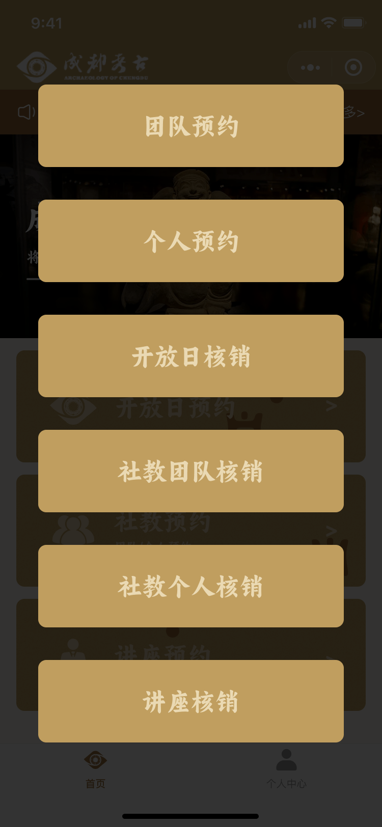 為了提高考古活動的組織和管理效率,小程序特別設計了開放日核銷、社教團隊核銷、社教個人核銷和講座核銷等功能。這些功能幫助工作人員快速確認參與者的預約信息,確保活動的順利進行。同時,核銷功能也為用戶提供了一種便捷的簽到方式,提升了整體的活動體驗。