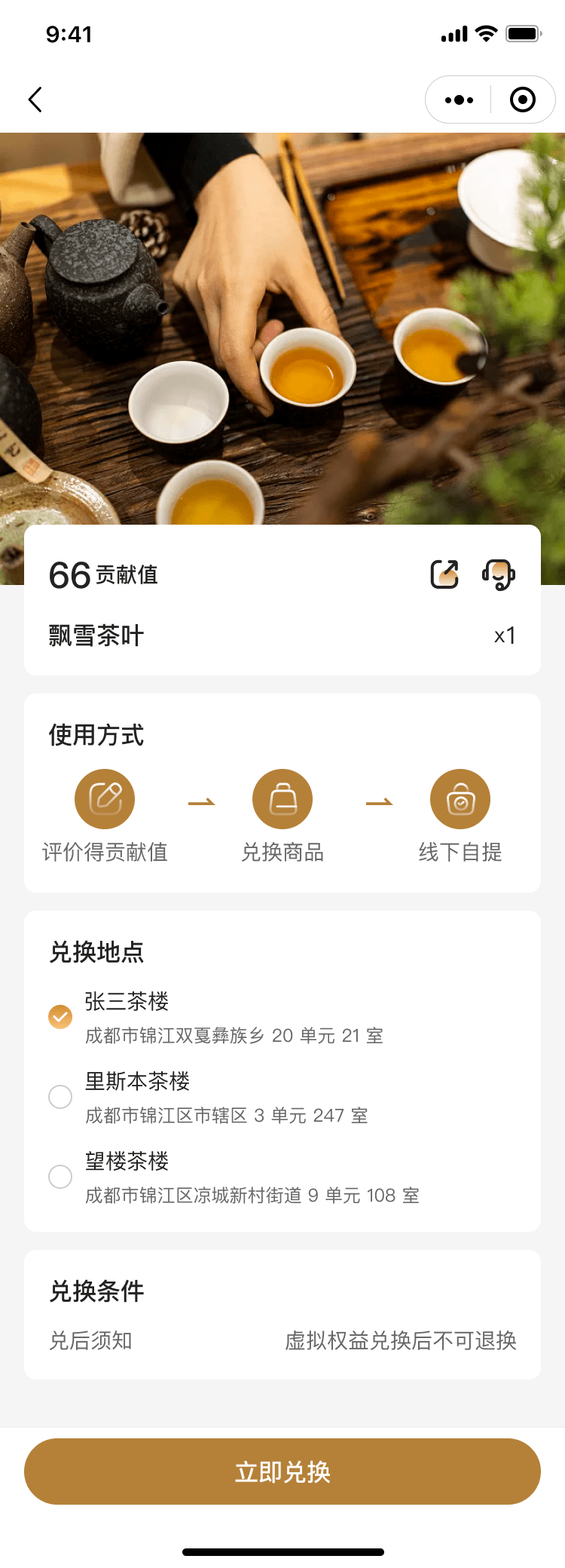 為了回饋廣大用戶,茶館預約小程序特設積分兌換功能。用戶在預約喝茶、參與活動等方面均可獲得積分,積分可兌換茶館優(yōu)惠券、茶品、周邊產(chǎn)品等。通過積分兌換,用戶在品茶的同時,還能享受到更多實惠和驚喜。