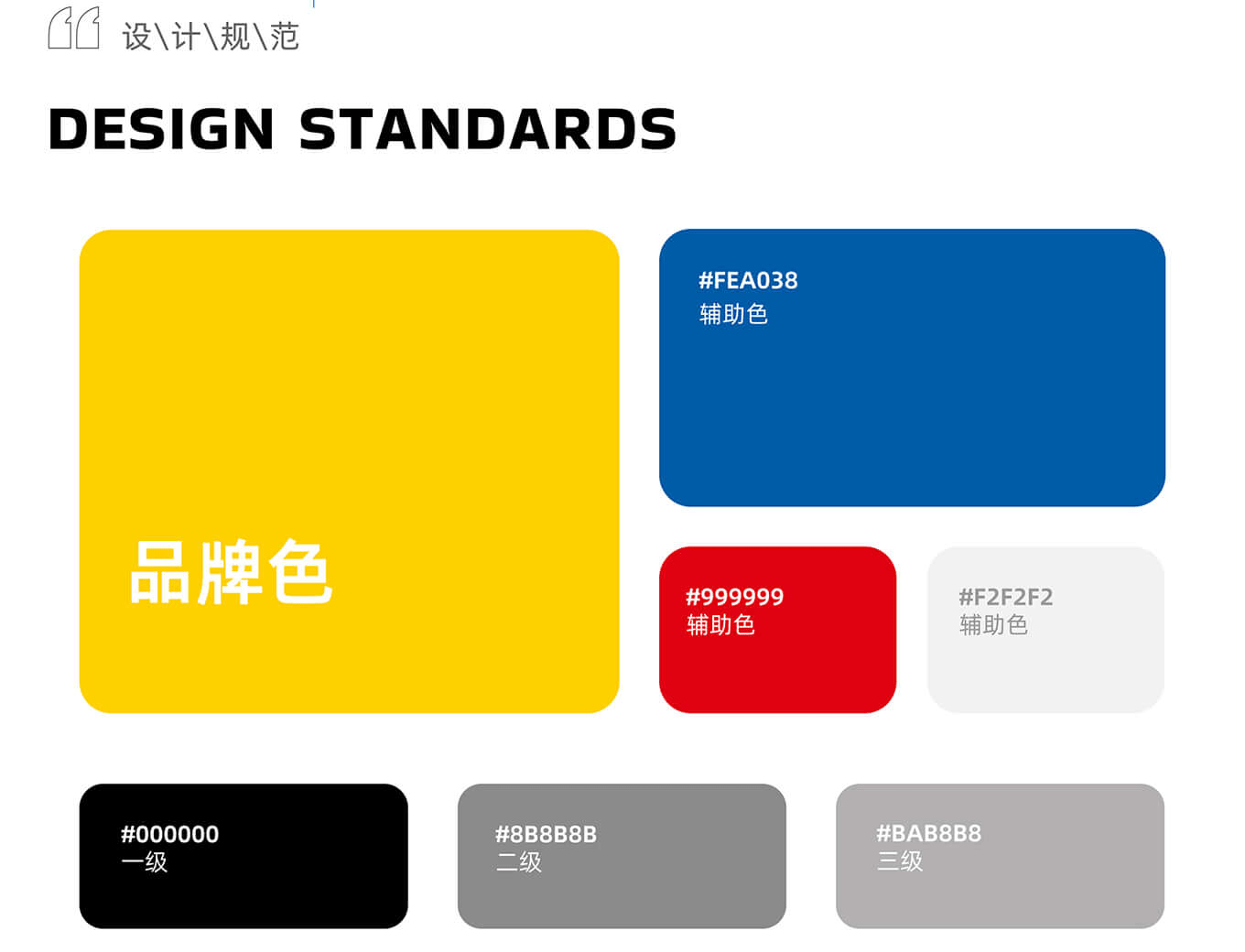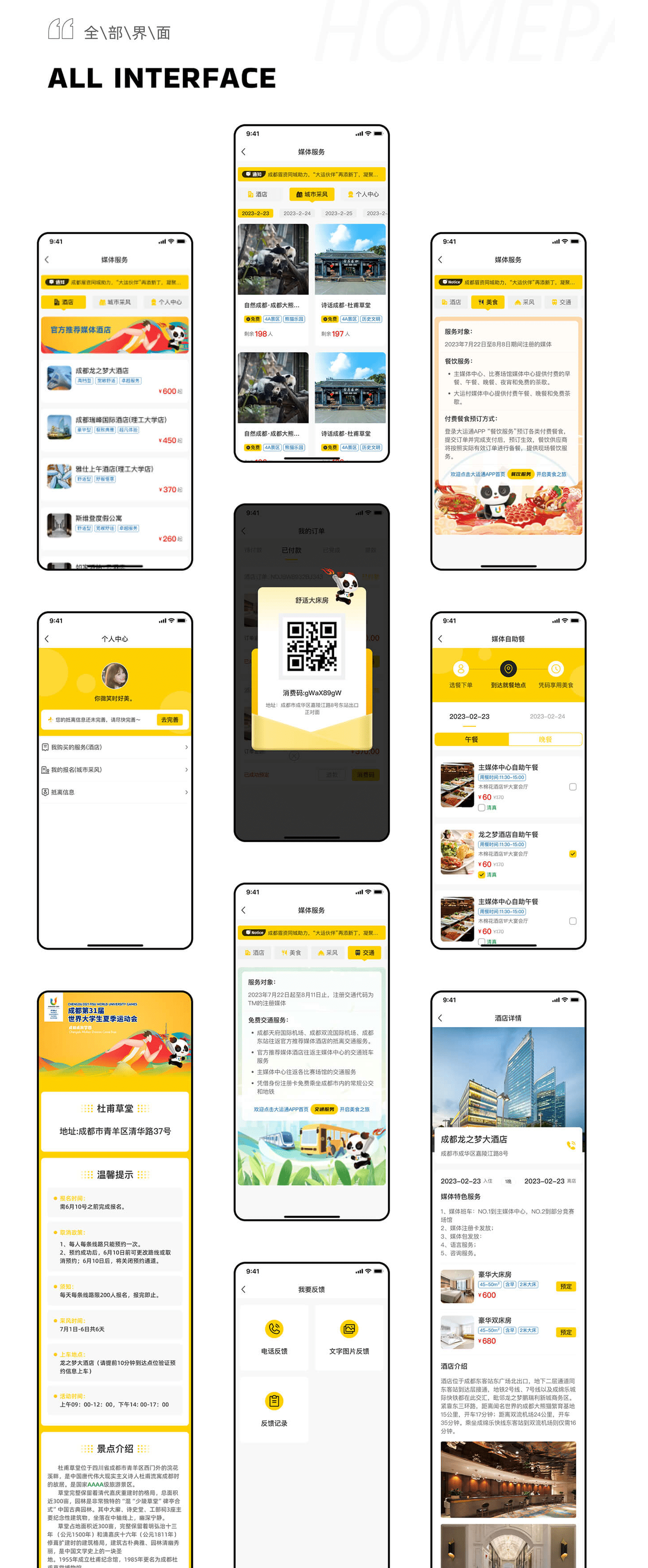 從設計規范上,我們看到,軟件的主色(品牌色)為黃色(RGB編碼:fdd100),輔色為藍色(#FEA038)和紅色(#999999),過渡色為灰色(#F2F2F2)和黑色(#000000)。從風格定位上來說,結合大運會的運動場景,把主題梳理成三個關鍵詞:運動、高效、快捷,很好地詮釋了速度和節奏感,以及城市APP給大家帶來的便捷。