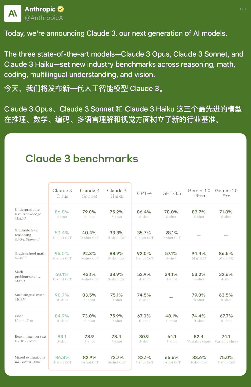 Claude 3系列包括三個模型:Claude 3 Haiku、Claude 3 Sonnet和Claude 3 Opus。這三個模型的能力依次從低到高,其中最強大的Claude 3 Opus在行業(yè)基準測試中表現(xiàn)優(yōu)于OpenAI的GPT-4和谷歌的Gemini Ultra。據(jù)Anthropic聲稱,Claude 3 Opus在知識水平、演繹推理和基礎數(shù)學等方面都表現(xiàn)出色,令人矚目。