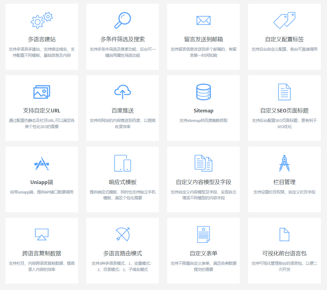 17. 可視化前臺語言包:平臺支持可視化管理前臺的語言包,以便二次開發。這有助于企業根據需求調整網站內容,提升用戶體驗。