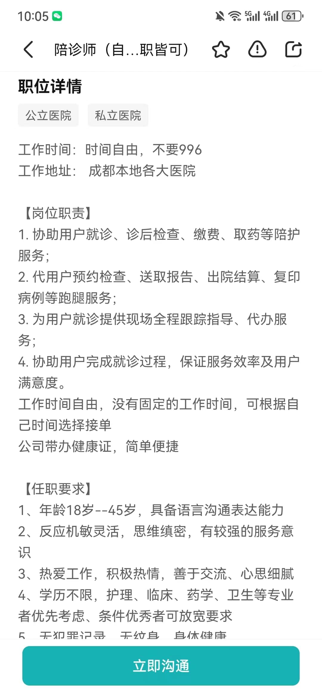 我特地在boss上搜索了陪診師職業。發現了蠻多的陪診師招聘信息,或全職或兼職。其中的一家招聘信息是這樣寫的: