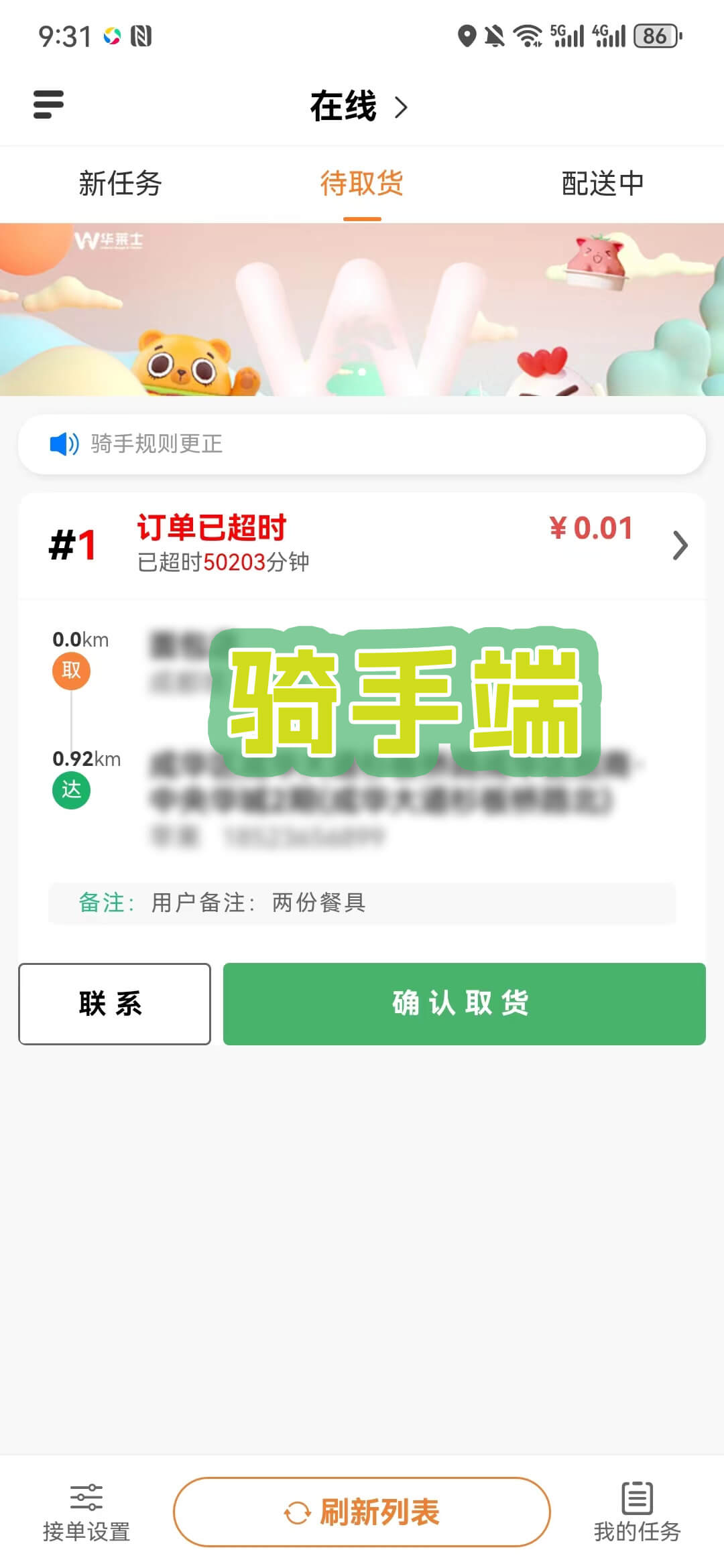主頁面布局清晰,分為新任務、待取件、代送達三個進度界面。訂單分類明確,根據用戶下達的不同類型的訂單,都會有明顯的標簽區分,如外賣訂單、普通訂單、跑腿訂單(幫買、幫送)、調度臺指派單、調度臺改派單、預約訂單等。