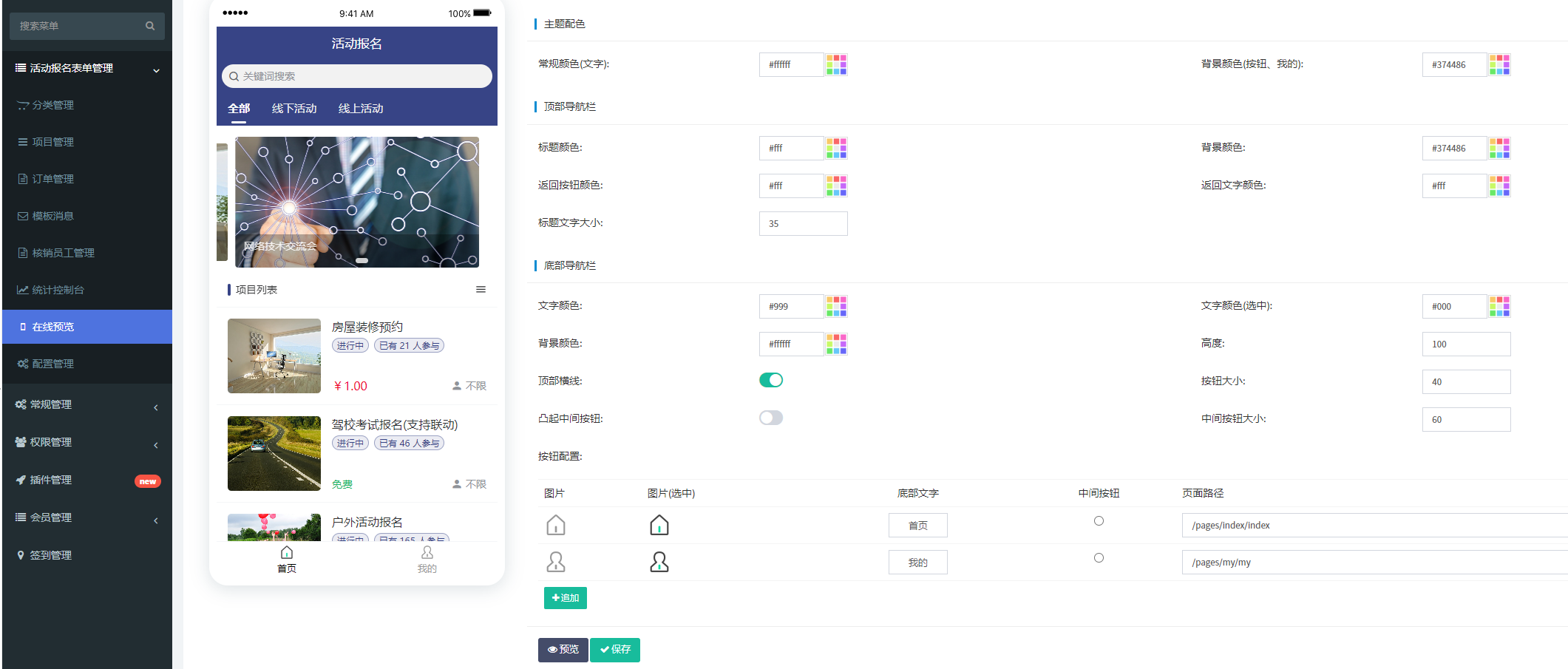 支持后臺配置移動端顏色、背景、文字等樣式,支持自定義導(dǎo)航欄,支持后臺實(shí)時預(yù)覽,讓您的小程序更具個性化。