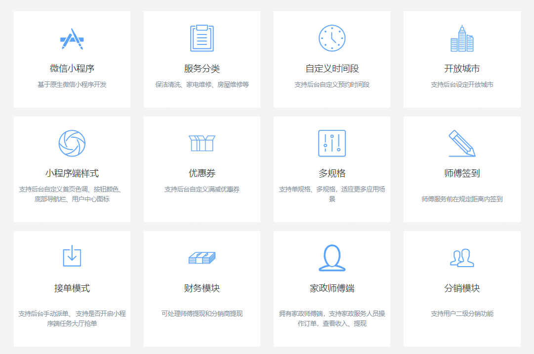 小火科技公司非常看好上門相關的服務,比如:上門家政、上門喂養寵物、上門老人護理、上門私教等服務。上門類服務的市場需求是非常巨大的,尤其是在效率就是金錢,服務到家的時代。有市場需求的地方就有商業價值。今天小火科技給大家推薦一款家政預約上門系統小程序,這是一款基于微信原生小程序的解決方案,旨在為用戶提供便捷、高效的家政服務預約體驗。小程序擁有多樣化服務、靈活的預約時間、優惠券機制、多規格支持等功能,同時支持后臺自定義首頁樣式、開放城市設定、師傅簽到等管理功能。