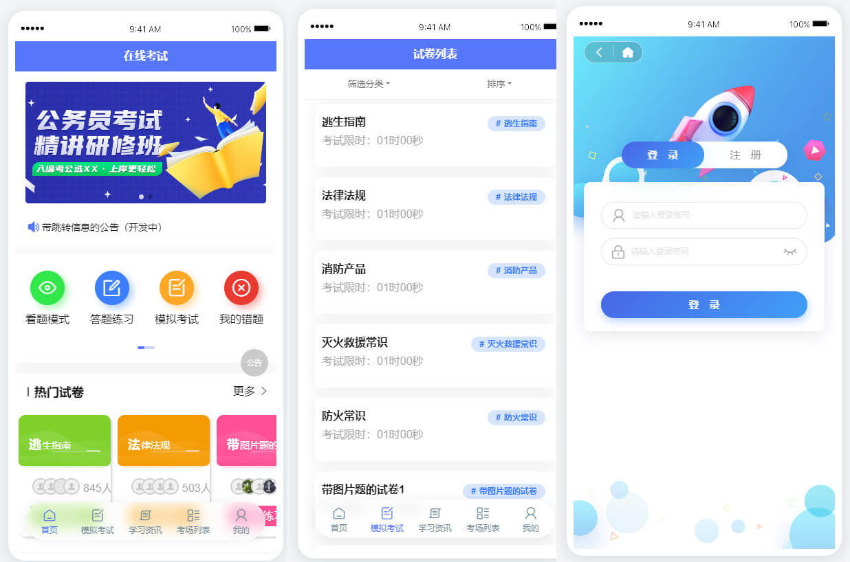考試系統(tǒng)支持模擬考試,用戶可以在模擬考試中熟悉考試流程和題型。同時(shí),考試系統(tǒng)還支持考卷分類,用戶可以根據(jù)學(xué)科、知識點(diǎn)等進(jìn)行考卷分類,便于管理和復(fù)習(xí)。