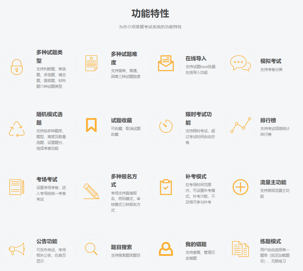 考試系統(tǒng)支持設(shè)置考場考卷,用戶可以進(jìn)入考場按統(tǒng)一考卷進(jìn)行考試。同時(shí),考試系統(tǒng)支持微信流量主功能,可以讓用戶在微信平臺上進(jìn)行分享和傳播。