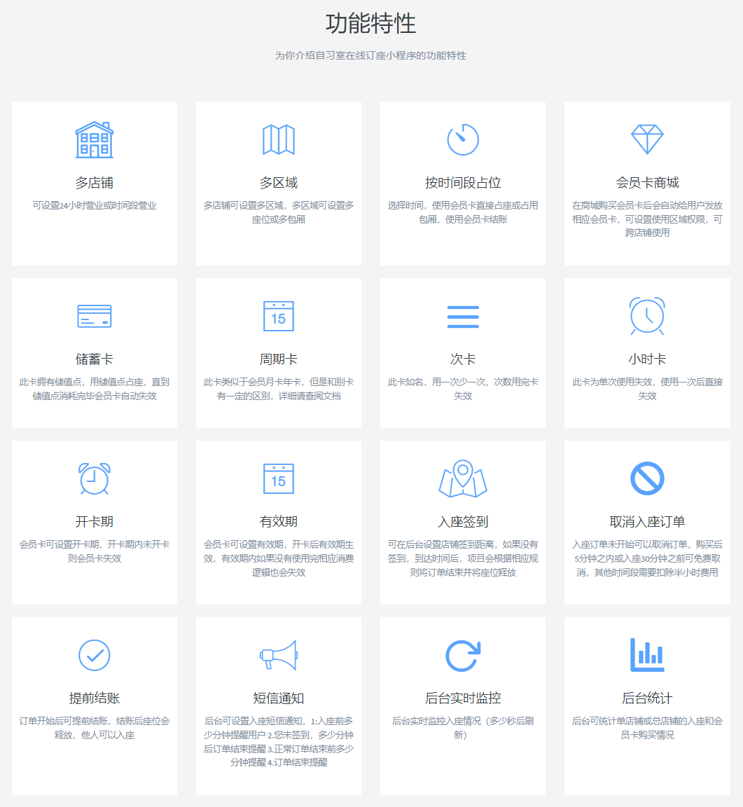 成都小火科技公司推薦一款自習室在線訂座小程序,這款小程序包含了多種功能,能夠滿足各種需求。同時該小程序注重用戶的體驗,在符合使用邏輯的基礎之上,進行了很多細節功能的優化。同時,小火科技對平臺的數據進行嚴格的加密,保證用戶的隱私。下面我們詳細介紹這款在線預約自習室微信小程序的功能。