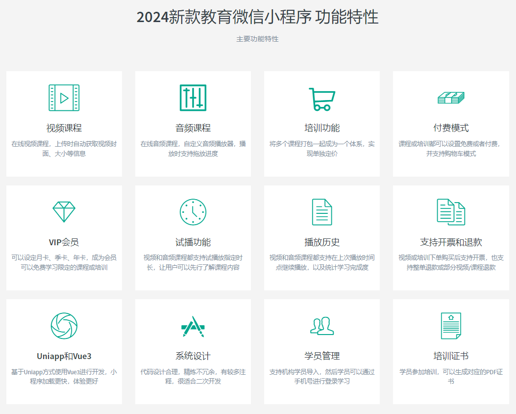 在系統(tǒng)設(shè)計(jì)方面,小程序的代碼結(jié)構(gòu)合理、精煉,且包含較多注釋,便于二次開發(fā)和維護(hù)。培訓(xùn)功能方面,多個(gè)課程可以被打包成為一個(gè)體系,實(shí)現(xiàn)單獨(dú)定價(jià)。播放歷史功能支持視頻和音頻課程在上次播放時(shí)間點(diǎn)繼續(xù)播放,以及統(tǒng)計(jì)學(xué)習(xí)完成度。