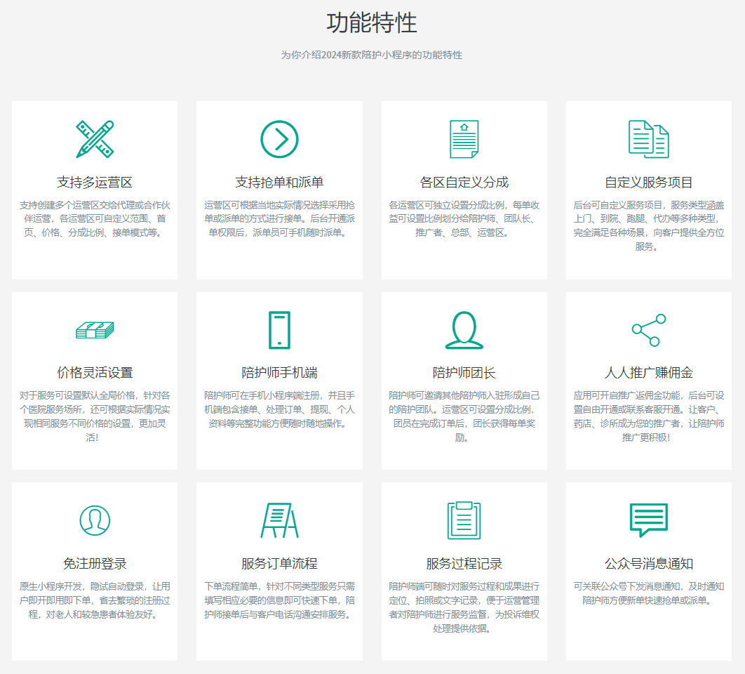 該小程序支持多運(yùn)營區(qū),允許創(chuàng)建多個(gè)運(yùn)營區(qū)并交給代理或合作伙伴運(yùn)營。各運(yùn)營區(qū)可以自定義范圍、首頁、價(jià)格、分成比例和接單模式,以滿足不同地區(qū)的需求。此外,該小程序還支持價(jià)格的靈活設(shè)置,既可以設(shè)置全局默認(rèn)價(jià)格,也可以針對各個(gè)醫(yī)院服務(wù)場所根據(jù)實(shí)際情況實(shí)現(xiàn)相同服務(wù)不同價(jià)格的設(shè)置。