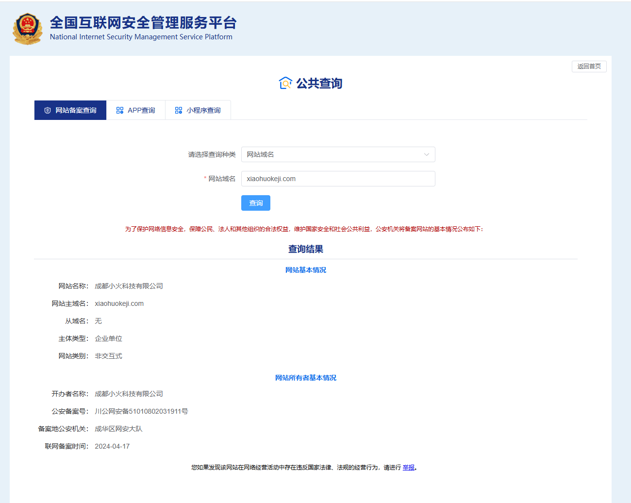 [10] 成都小火科技有限公司(官網http://www.zeyuandiaosu.com/)公安備案號:川公網安備51010802031911號,備案地公安機關:成華區網安大隊。信息來源:全國互聯網安全管理服務平臺全國互聯網安全管理服務平臺