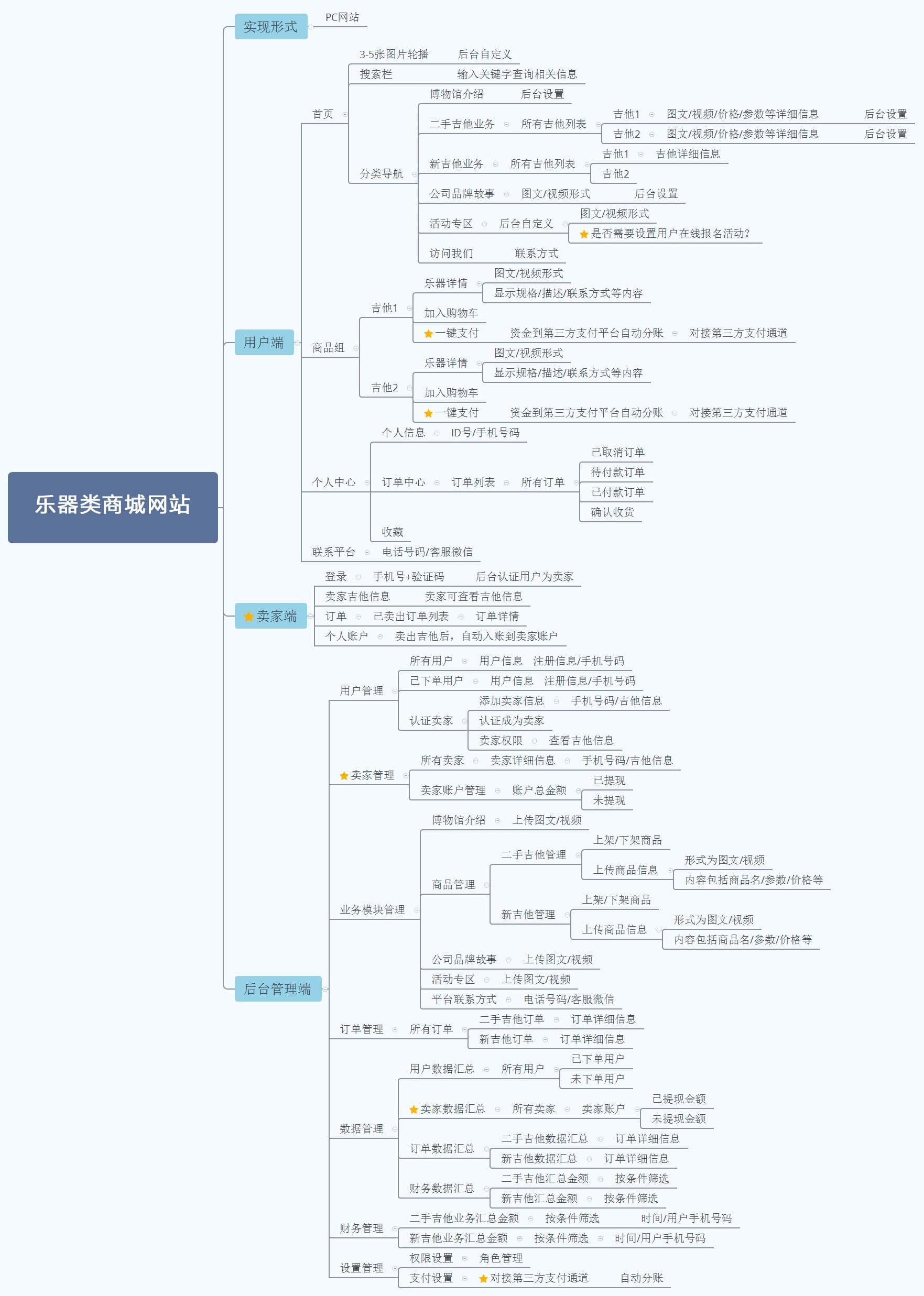 下面我們來看看這個樂器類商城的功能和界面梳理。首先是用戶端,既然是一個商城,不論是小程序也好,APP也好,還是WEB端也好,界面的展示內容大致是相同的。前期要根據用戶的定位而選擇,比如客戶是想為了上架,想有更好的自主權,那么選擇APP;如果客戶是想借助某信平臺,方便轉發分享,那么選擇微信小程序。