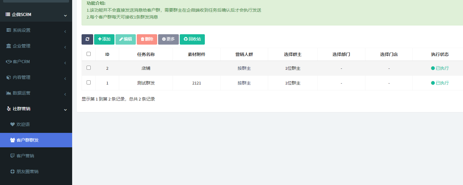 群發營銷功能模塊允許企業通過后臺設置群發任務及執行員工,一鍵群發至客戶個微和群聊。這樣,企業可以快速地將營銷信息傳達給客戶,提高信息傳達效率。